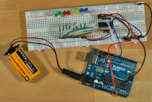 For the next project, we have a program that cycles through a series of LEDs. Eight of the LEDs are lined up on the breadboard, all being run through a driver ship which is then wired into the main board.