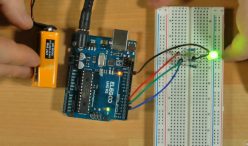 First, we have a simple RGB LED cycling through its color array. This simple project demonstrates the Arduino’s ability to utilize the full color array of the LED which could be taken advantage of for any project which requires running complex LED lighting, such as running the lighting effects of a small studio.