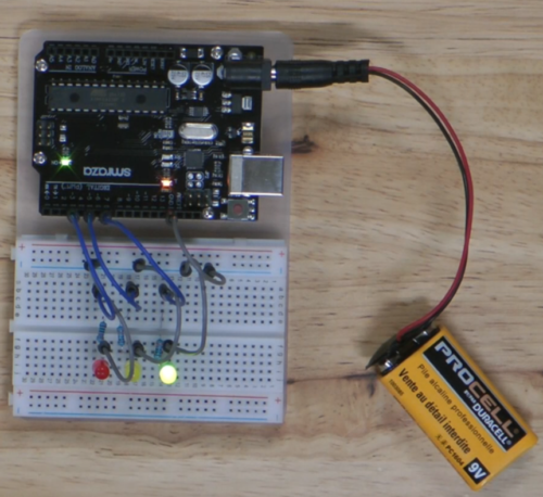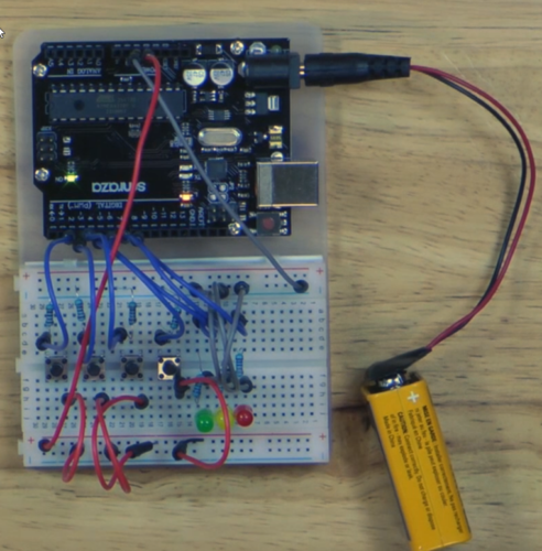 First, we have a neat little Traffic light setup, working off of predetermined intervals. The Green light starts off solid and shining, then after five seconds, it switches to the yellow light, which blinks on and off in half second intervals, before turning red for five seconds. The red then cycles back to green and it repeats. I’d love to try and rework it to change based on proximity input, maybe using a sensor to detect an approaching object. If you would be interested in a course from us experimenting with the different possibilities of the Arduino chip, make sure to leave a comment down below.