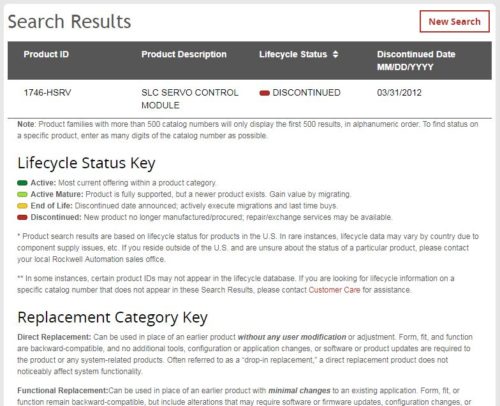 Step 8: When the “Search Results” returns the listing for the 1746-HSRV, it shows the HSRV’s last date of manufacture was in the past, 03/31/2012, and therefore the product is listed as “Discontinued:”